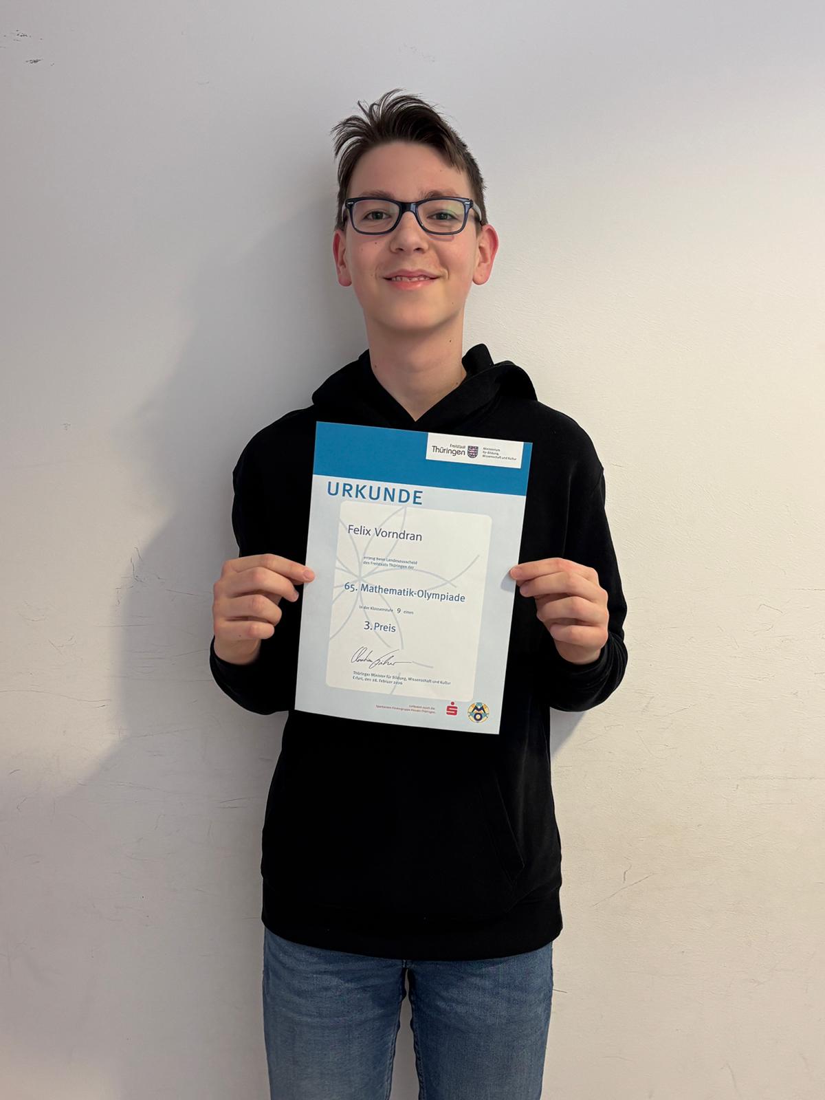 Felix nimmt bereits seit Klasse 5 regelmäßig an der Mathemtikolympiade teil und hat sich über diese Zeit wohl zum echten Profi entwickelt.Weiter so.
